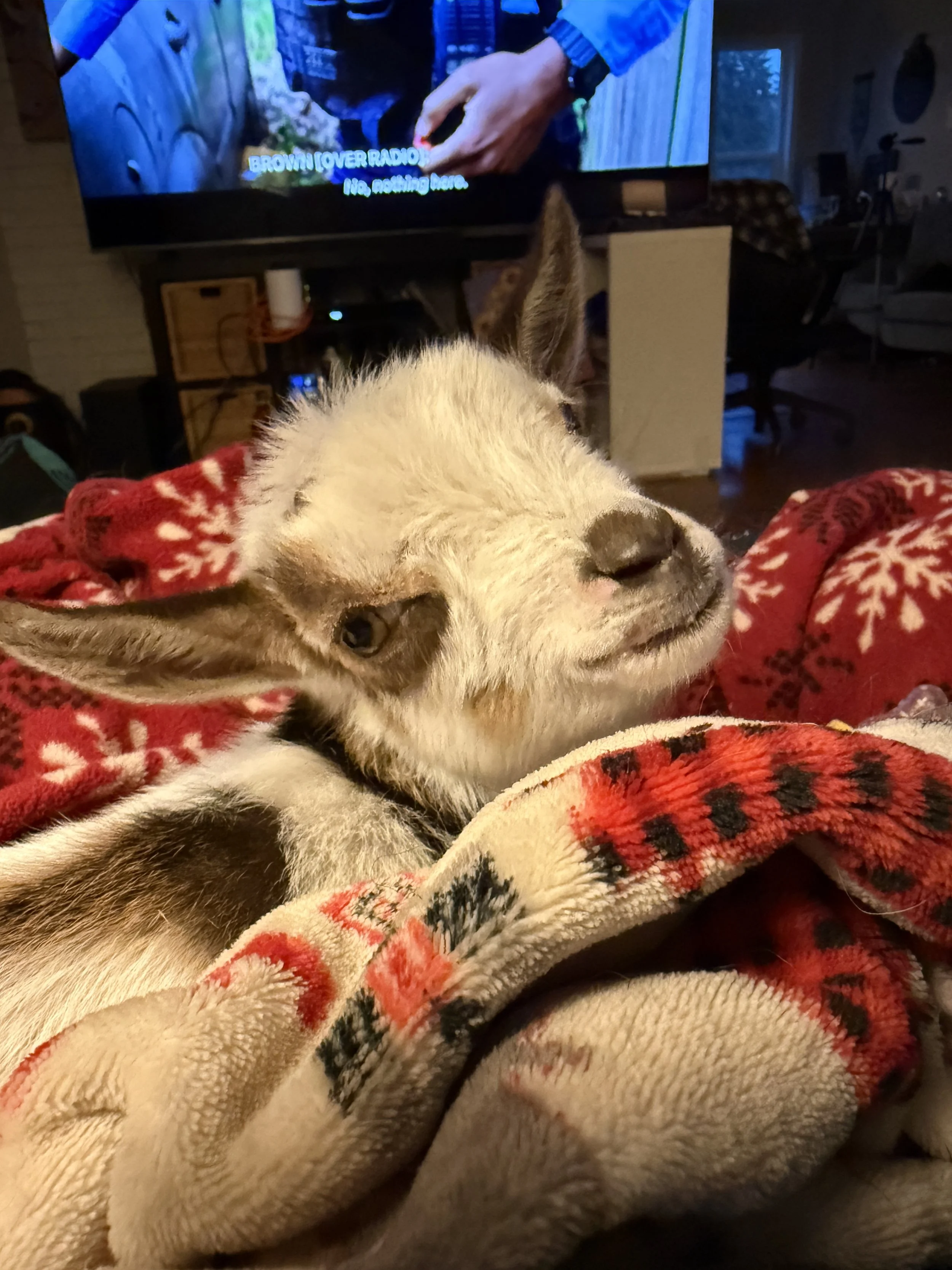 Their first stop is my living room, which doubles as the nursery. It’s warm, quiet, and close enough that I can respond quickly when they need something. Having them inside means I can care for them at the drop of a hat—late‑night feedings, temperature checks, or just a reassuring moment of contact. Once they’re eating well and consistently, they transition out to the kid barn, where they have more space to explore and start discovering their place in the little herd forming around them.